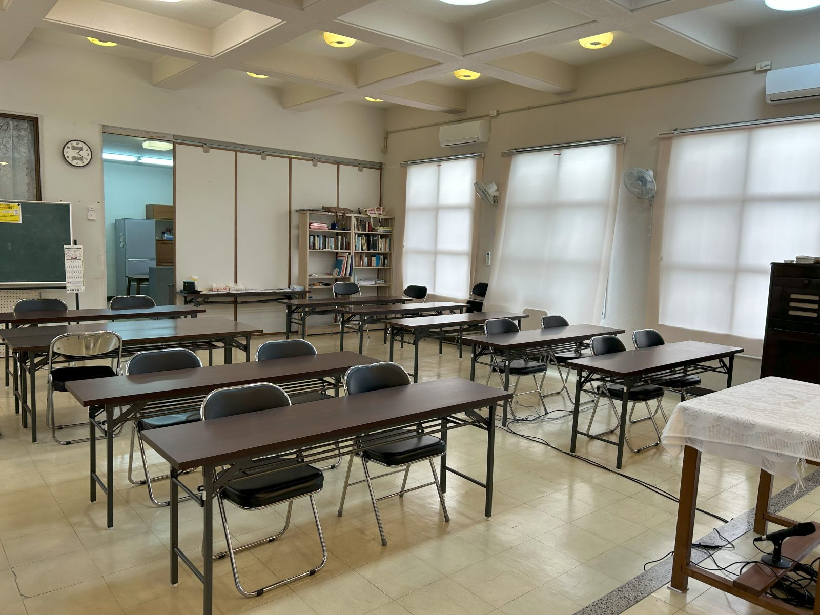 礼拝堂は机と椅子が並んでいます。椅子は最近新調し、ゆったりと座れるものにしました。照明も順次新しいもの(LED)に交換していきます。